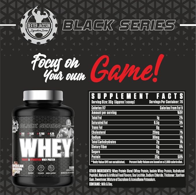 Dexter Jackson Black Series Whey Protein Powder is a high-performance protein formula crafted to support lean muscle building, faster recovery, and enhanced workout strength. Its ultra-pure whey blend fuels your body with clean, fast-absorbing protein for maximum results.